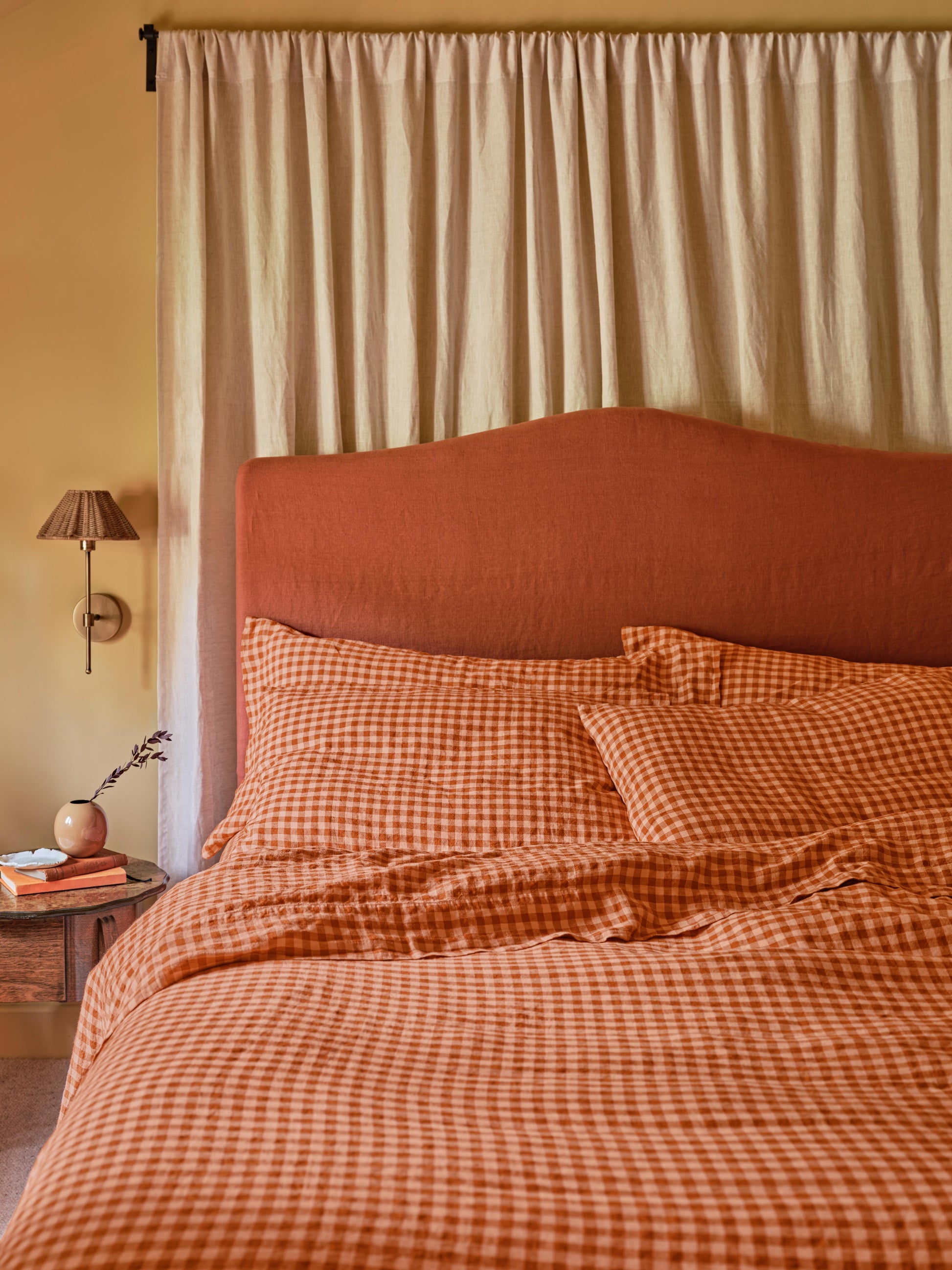 Pairing rich Cinnamon with soft Peach, our Colour Drenched Gingham 100% linen duvet cover serves up the perfect laid-back, layered look. Made from European flax for a beautiful lived-in look, our linen bedding is lightweight, durable and only gets softer with wear. All our linen duvet covers feature coconut shell button fastenings and handy inside corner ties to stop your duvet from slipping.