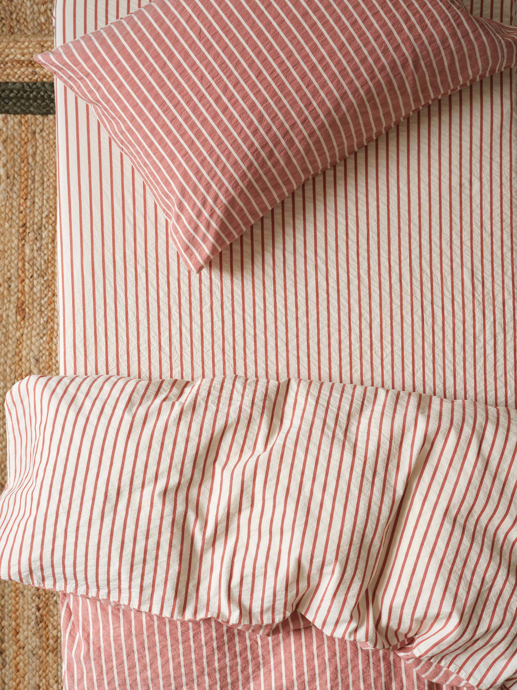 Crafted with a softly textured finish for that playful, lived-in feel, this Auburn Red Textured Stripe fitted sheet is designed for easy mix-and-match styling. Crafted from sustainably sourced cotton, our kids bedding has a super soft, breathable feel that’s gentle on even the most sensitive skin. Our kids fitted sheets are suitable for cot bed mattresses (70 x 140 x 15cm) and have elasticated edges all the way around for a perfectly snug fit.