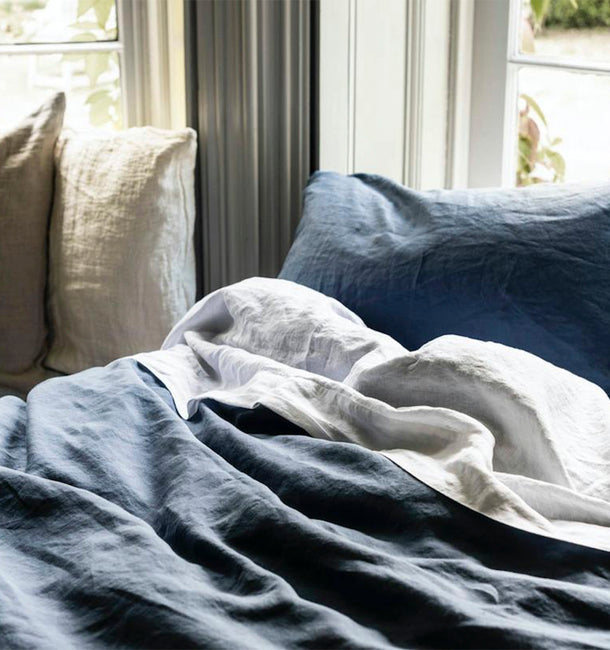 Our Blueberry linen blend duvet cover is a versatile dusky blue hue that works in calm, cosy and dramatic spaces. Made from only the highest-quality fibres, the breathable fabric combines the effortless look of linen with the softness of cotton. Our linen blend duvet covers are finished with coconut shell button fastenings and feature handy inside corner ties to stop your duvet from slipping.