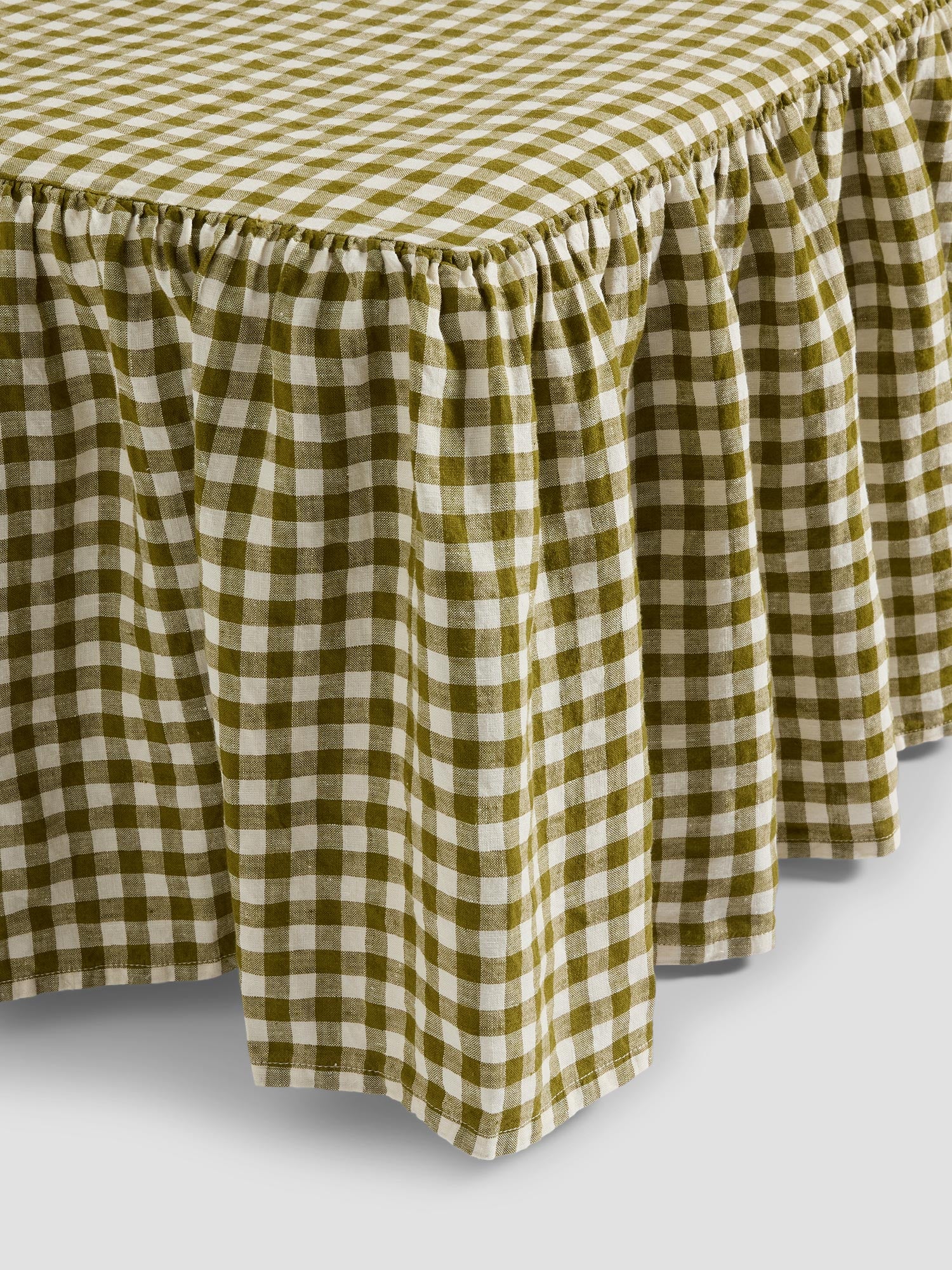 Add a touch of modern cottagecore style to your bedroom with our Botanical Green Gingham 100% linen valance. Featuring our signature gingham pattern, this classic gathered skirt drapes beautifully with its soft frills. Our bed valances have a 38cm drop from the base to the floor and come in four sizes for single, double, king and super king beds.