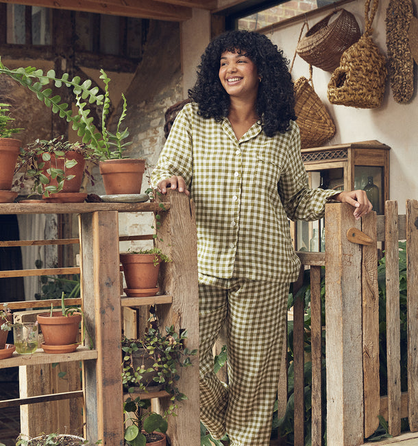 Made for those who like their sleepwear to be timeless yet comfortable, our Botanical Green Gingham Linen Pyjama Shirt is made from super soft 100% stonewashed linen. Linen keeps you cosy and warm in the winter and cool in the summer. Our linen pyjama shirt can be paired with our pyjama trousers to complete the look. Our gingham sleepwear is an oversized, and more relaxed fit than our core range; we recommend sizing down if a more snug fit is desired.