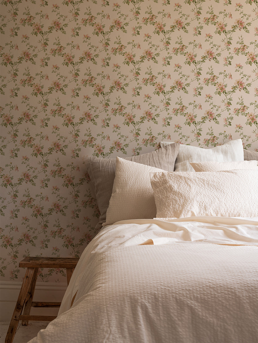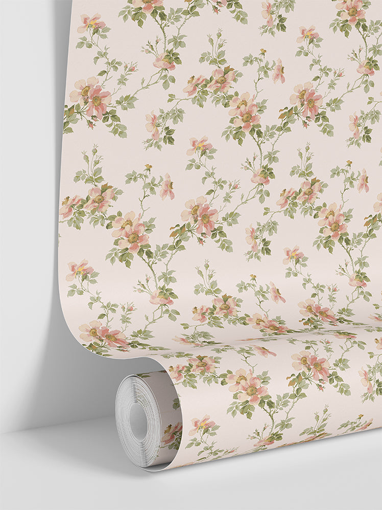 Featuring the romantic native flower of its namesake, this whimsical Field Rose wallpaper brings vintage-inspired style to the modern home. Our non-woven wallpaper is easy to apply and incredibly hardwearing, with a thick feel and textile-like appearance.