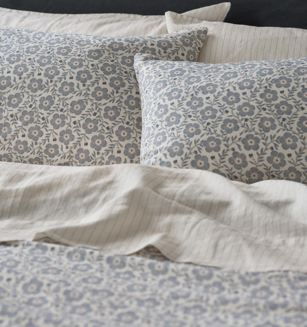 Inspired by traditional weaving techniques, our Dusk Blue Folk Stripe fitted sheet features a subtle yarn-dyed stripe that beautifully complements the cornflower motif across the collection. Made from only the highest-quality fibres, this bedding combines the effortless look of linen with the softness of cotton. Like all our fitted sheets, it has elasticated edges right the way around and fits mattresses up to 40cm deep. Plus, handy inner labels make it easy to tell the long side from the short.
