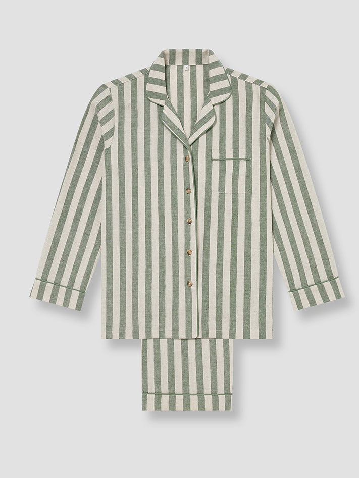 Slip into our Fern Green Pembroke Stripe pyjama set for elevated evenings on the sofa and leisurely mornings in bed. Crafted from our signature fabric blend, these breathable pyjamas combine the effortless look of linen with the gentle softness of cotton.