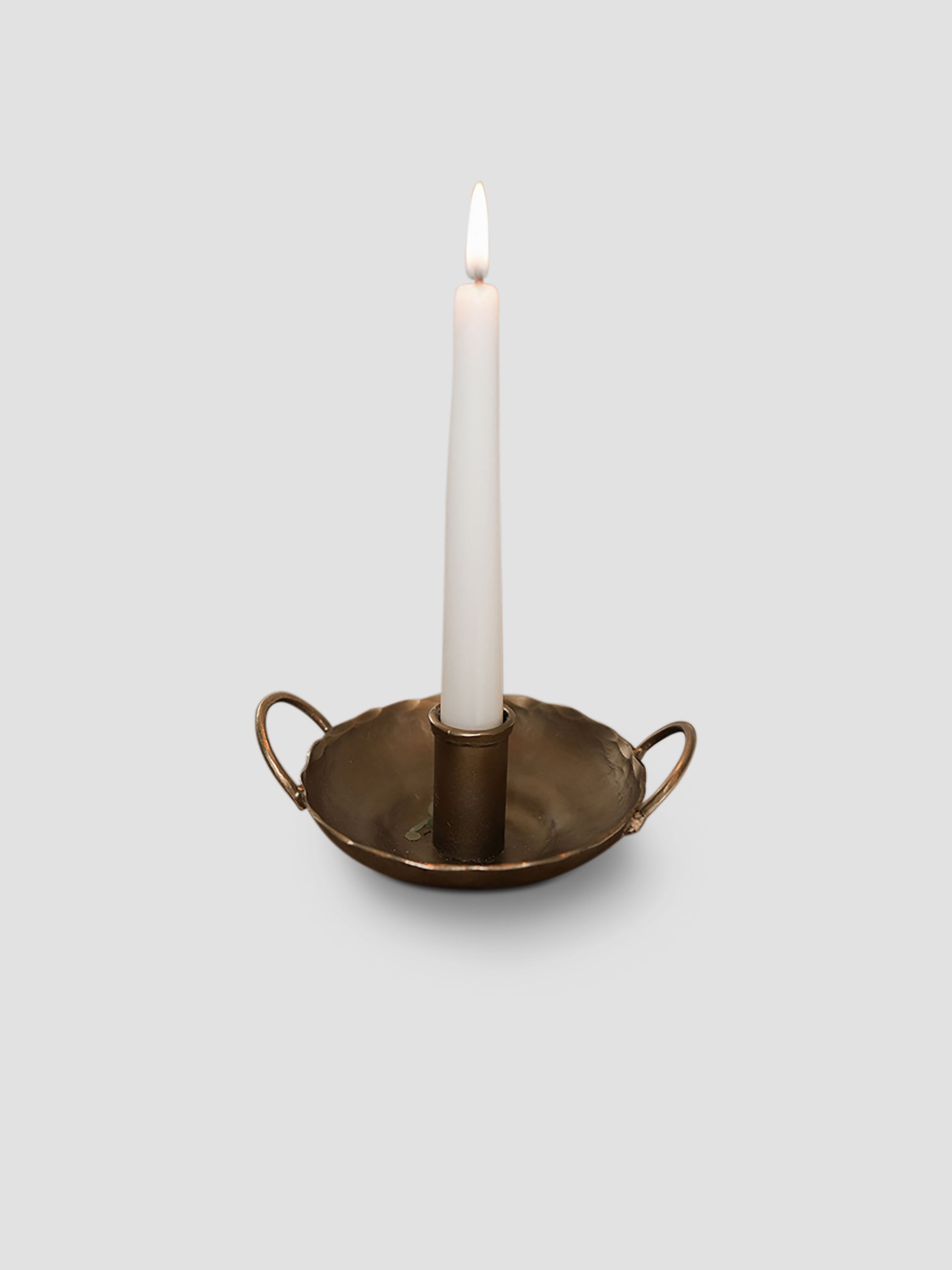 Add a touch of charm to your table or mantelpiece with the Forged Brass dish candle holder. Crafted from iron with a beautiful brass finish, each piece is hand-finished by skilled artisans in India, featuring delicate handles for a unique look. Pair with our beeswax dining candles for a warm, inviting ambience.