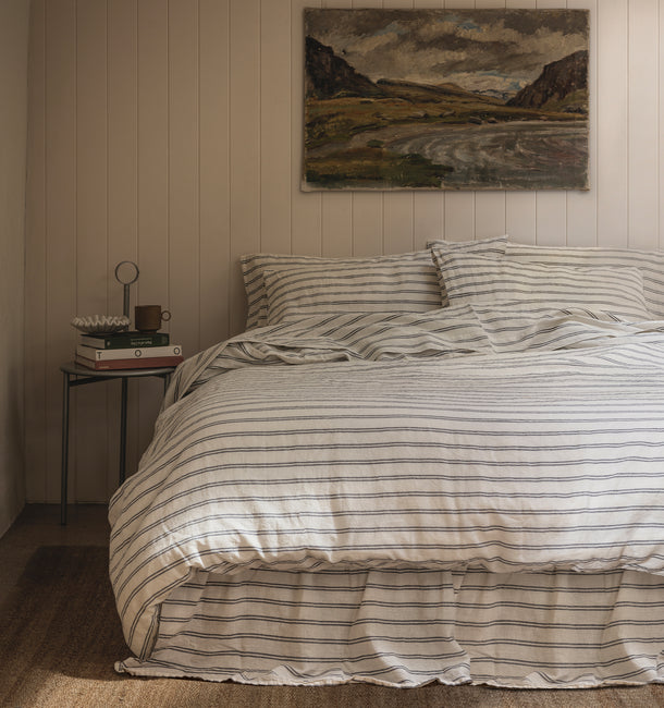 Our yarn-dyed Ivory Kemptown Stripe linen blend duvet cover has a timeless appeal that works in both classic and contemporary spaces. Made from only the highest-quality fibres, the breathable fabric combines the effortless look of linen with the softness of cotton. Our linen blend duvet covers are finished with coconut shell button fastenings and feature handy inside corner ties to stop your duvet from slipping.