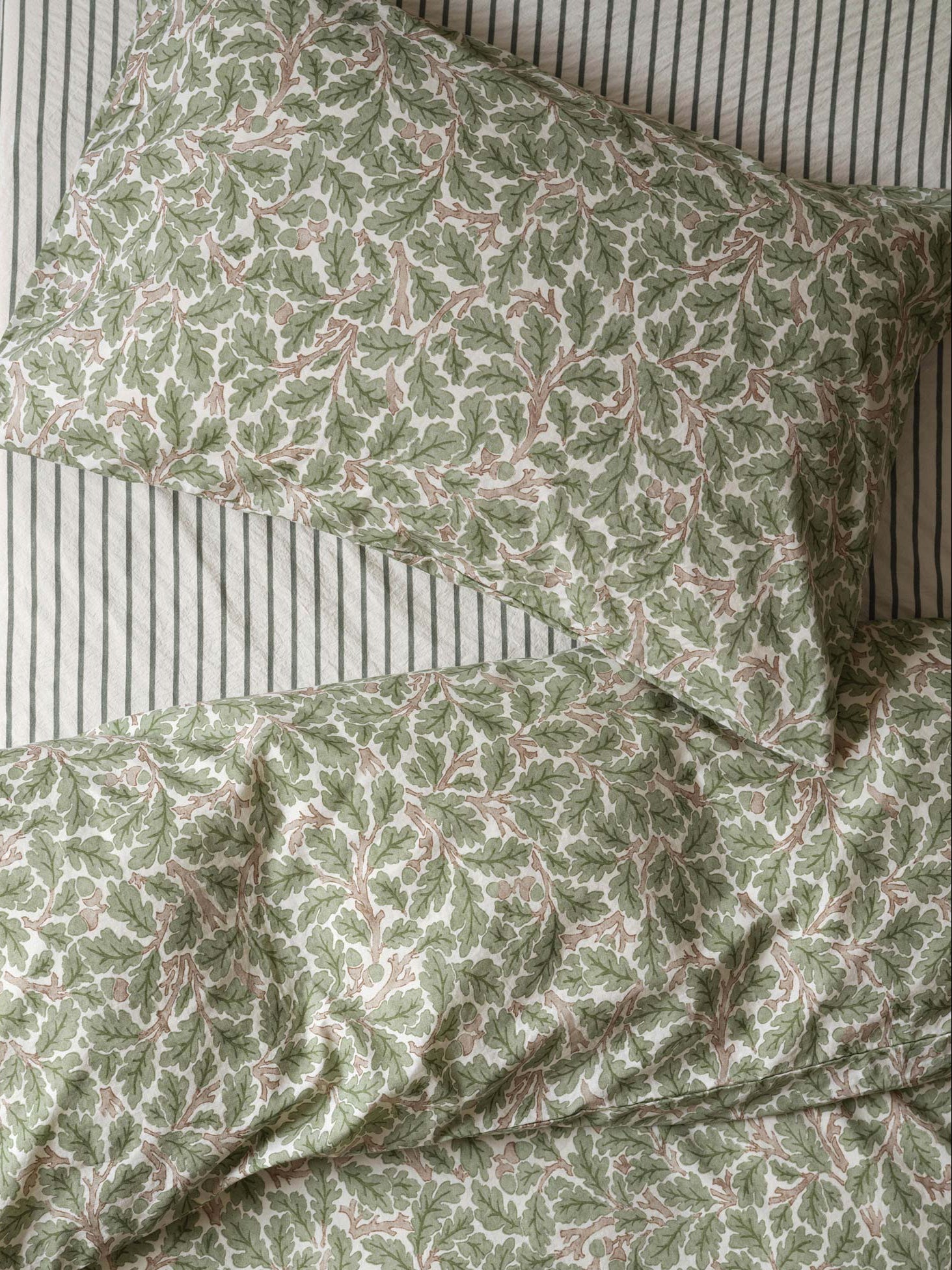 Climbing branches, scattered acorns, and a soft Leafy Arbour green - this Morris & Co. Oak bedding set will turn your little one’s bedroom into a charming woodland escape. Crafted from sustainably sourced cotton, our kids bedding has a super soft, breathable feel that’s gentle on even the most sensitive skin. The cot size duvet cover is designed with an internal flap, which closes inside the cover and holds the duvet in place. The single size duvet cover features natural corozo buttons, so to ensure children's safety, please fasten the buttons inside.