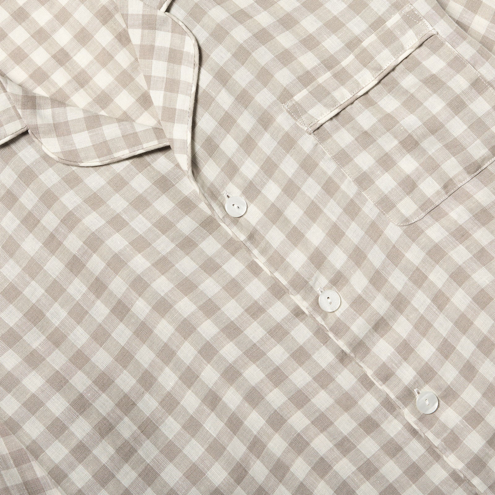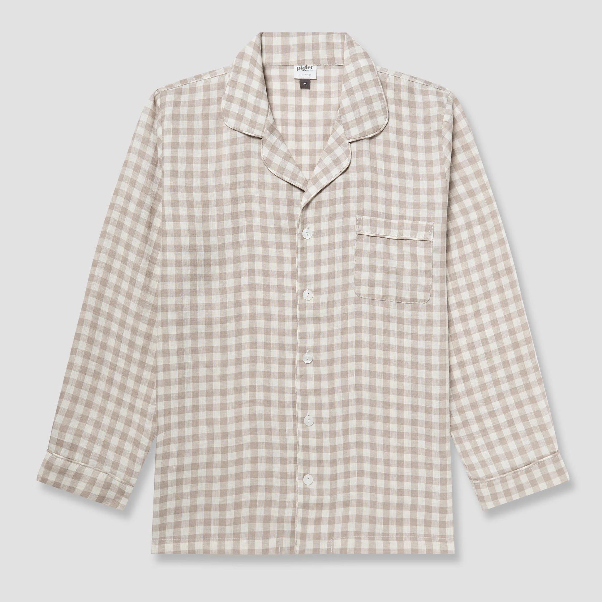 For a blissful night's kip, snuggle into nostalgic neutrals with our Mushroom Gingham Linen Pyjama Shirt, made from super soft 100% stonewashed linen. Made for slow weekend mornings and cosy nights in, our gingham linen sleepwear collection is completely natural and thermo-regulating, keeping you snug during winter and cool throughout the summer. This whimsical print and organic-toned colour can be paired with our linen pyjama trousers to complete the look. Our gingham sleepwear is an oversized, and more relaxed fit than our core range; we recommend sizing down if a more snug fit is desired.