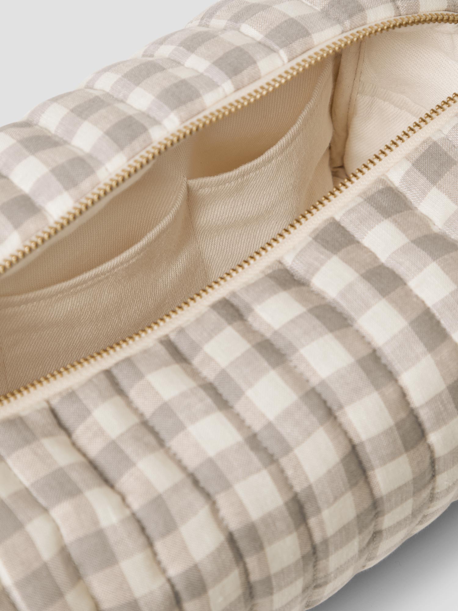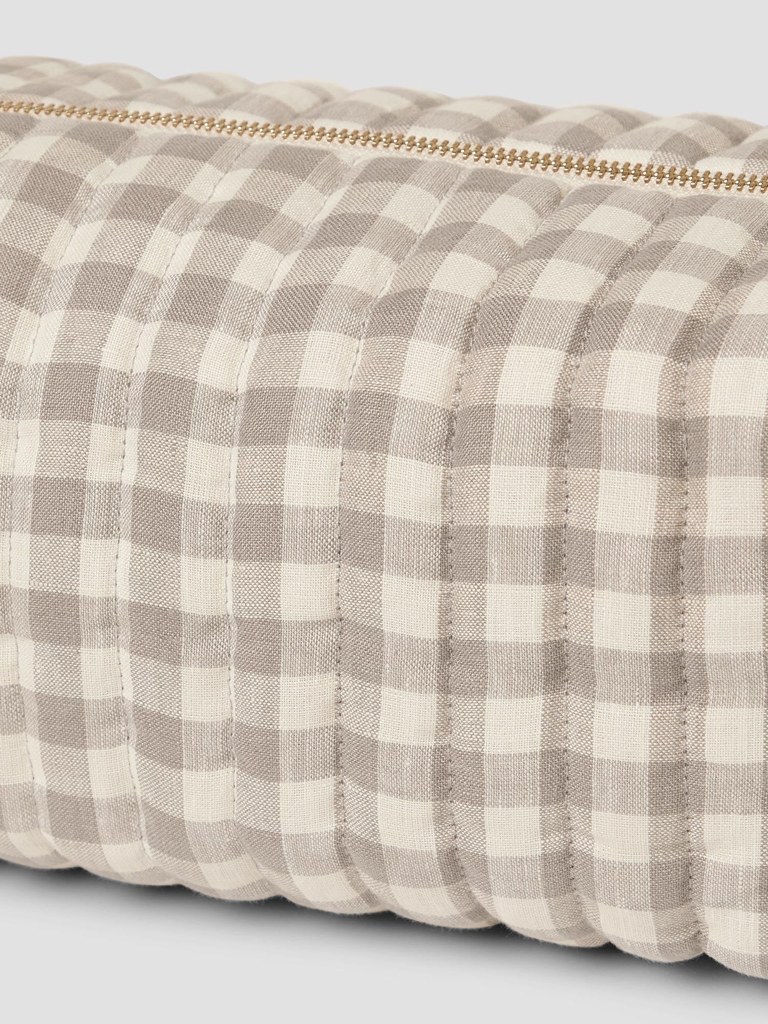 Keep your essentials neatly organised at home or on the go with our linen wash bag, thoughtfully crafted from offcuts of our 100% linen Mushroom Gingham fabric. Perfect for travel or tidying up your bathroom shelf, these wash bags have a quilted design, secure zipper closure and a coated cotton lining for easy cleaning.