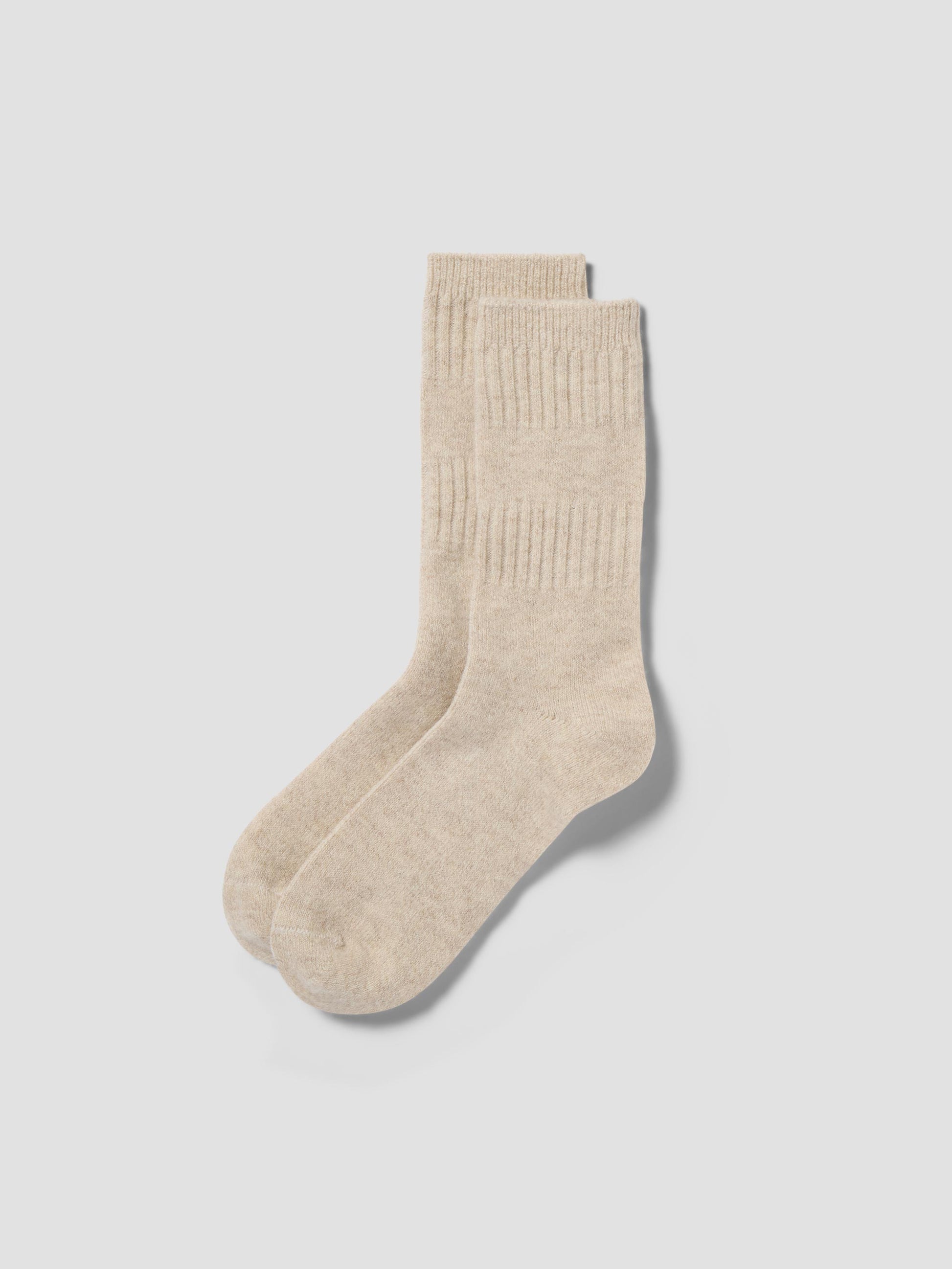 Keep your feet nice and toasty with these Oatmeal Merino Wool Ribbed Socks. Naturally breathable and thermoregulating, they feature a classic double-rib pattern and a subtle marl effect for a timeless, cosy finish – perfect for padding around the house or wearing under boots on a winter walk.