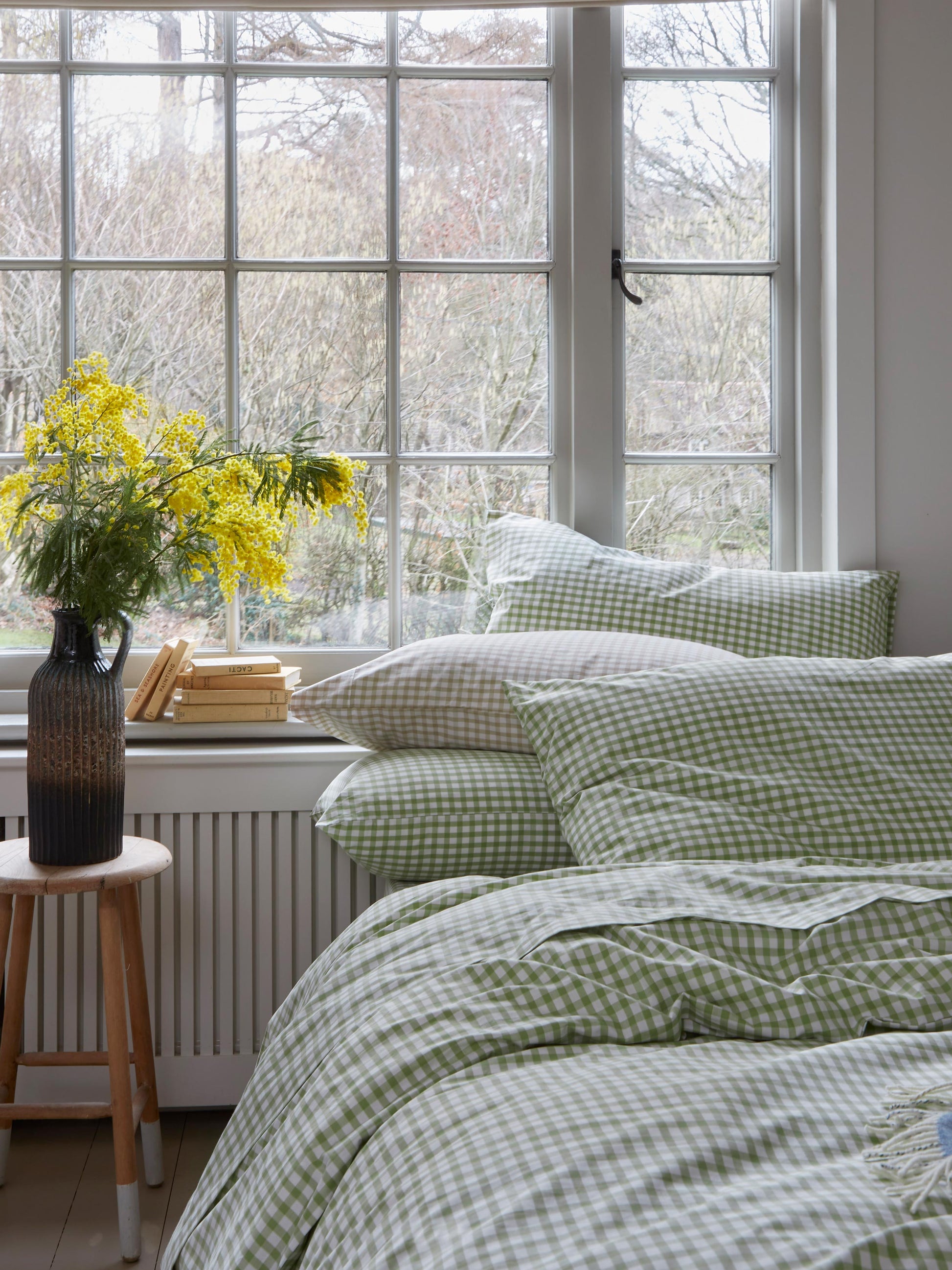 Our most-loved print: Gingham, is now available in crisp percale cotton. Made in Portugal from 100% cotton, our cotton gingham pillowcases will add a country-inspired feel to your bedroom. The percale weave allows for a matte finish, high breathability and relaxed look - perfect for lovers of high quality cotton bedding. Curate a unique bedtime look, sentimental to you and mix and match to your heart's content. Our Pear gingham cotton range adds a touch of timeless charm as a mono-print ensemble, but pairs beautifully with plain washed cotton colours: White, Parchment or Pear.