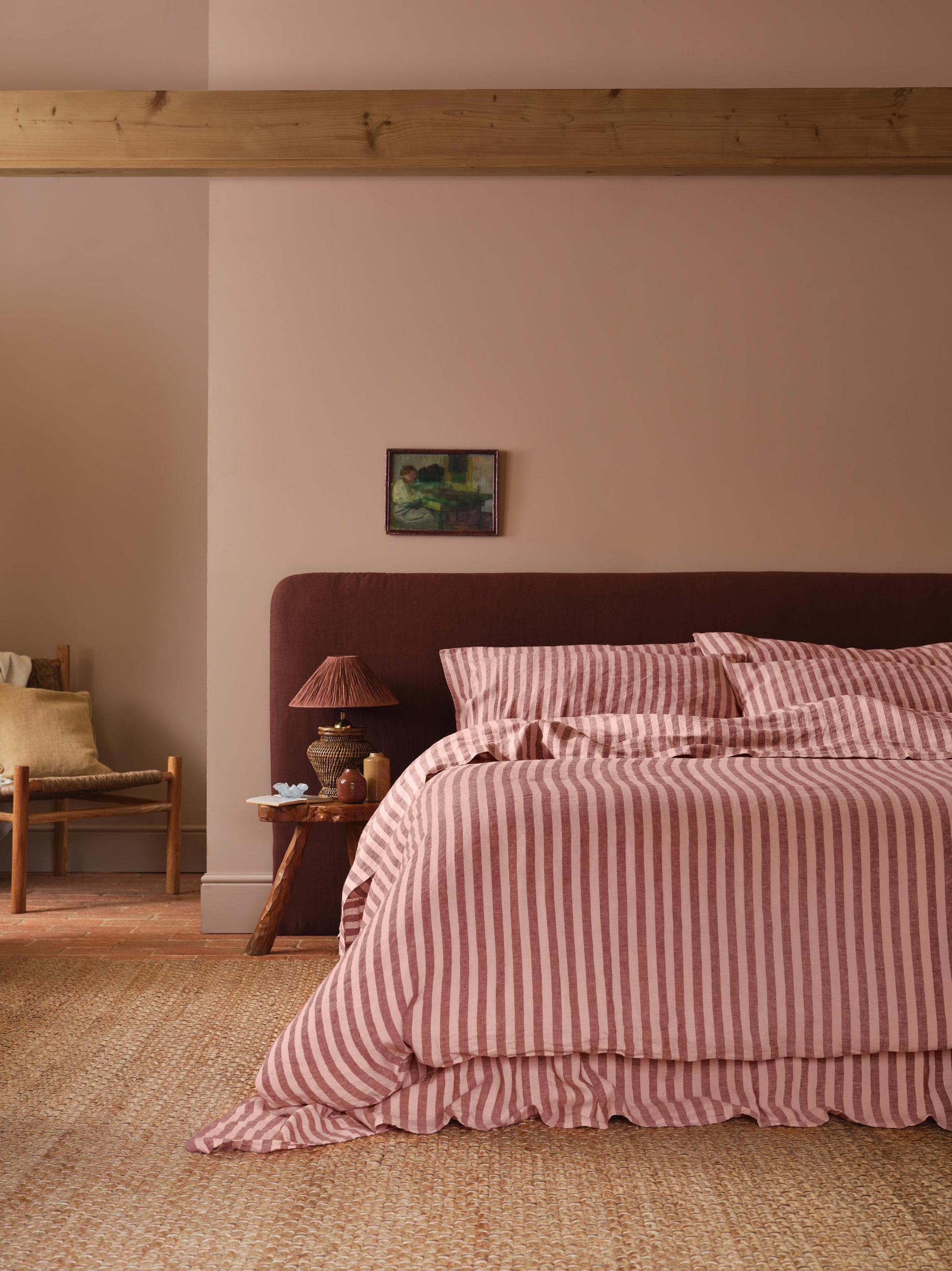 Nestle into nostalgia with our bold Rhubarb & Rose Pembroke Stripe 100% linen duvet cover. Made from European flax for a beautiful lived-in look, our linen bedding is lightweight yet durable and only gets softer with wear. All our linen duvet covers feature coconut shell button fastenings and handy inside corner ties to stop your duvet from slipping.