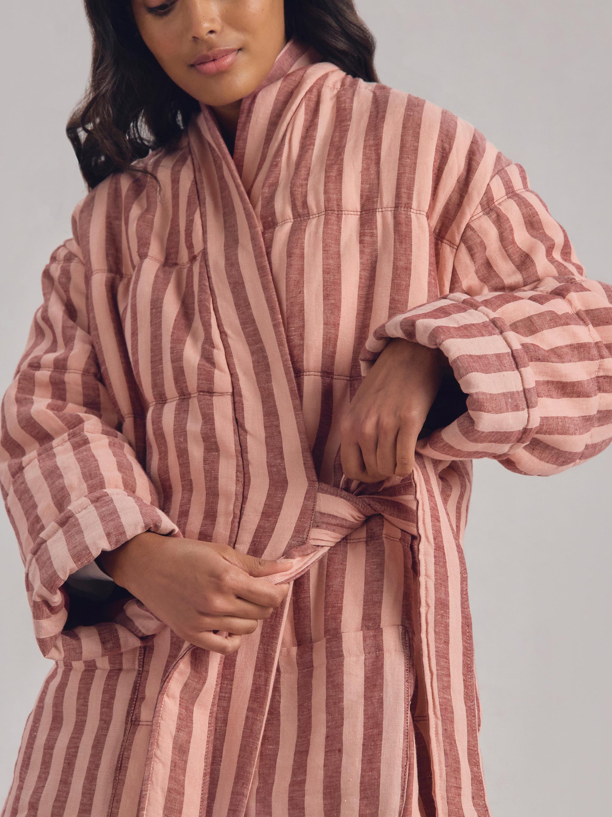 Rhubarb and Rose make the perfect pairing for our Pembroke Stripe linen blend housecoat. With its oversized style, quilted design and practical pockets, it’s your go-to for staying cosy – whether you’re making coffee on a chilly morning or snuggling up for the evening on the sofa.