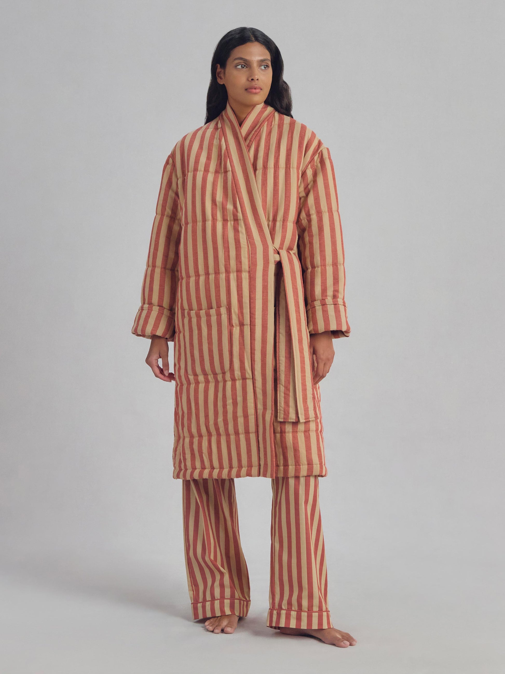 In our iconic Sandstone Red Pembroke Stripe design, this linen blend housecoat is your go-to for staying cosy – from chilly mornings to relaxed evenings on the sofa. With its oversized style, quilted design and practical pockets, it’s set to become your new loungewear staple.