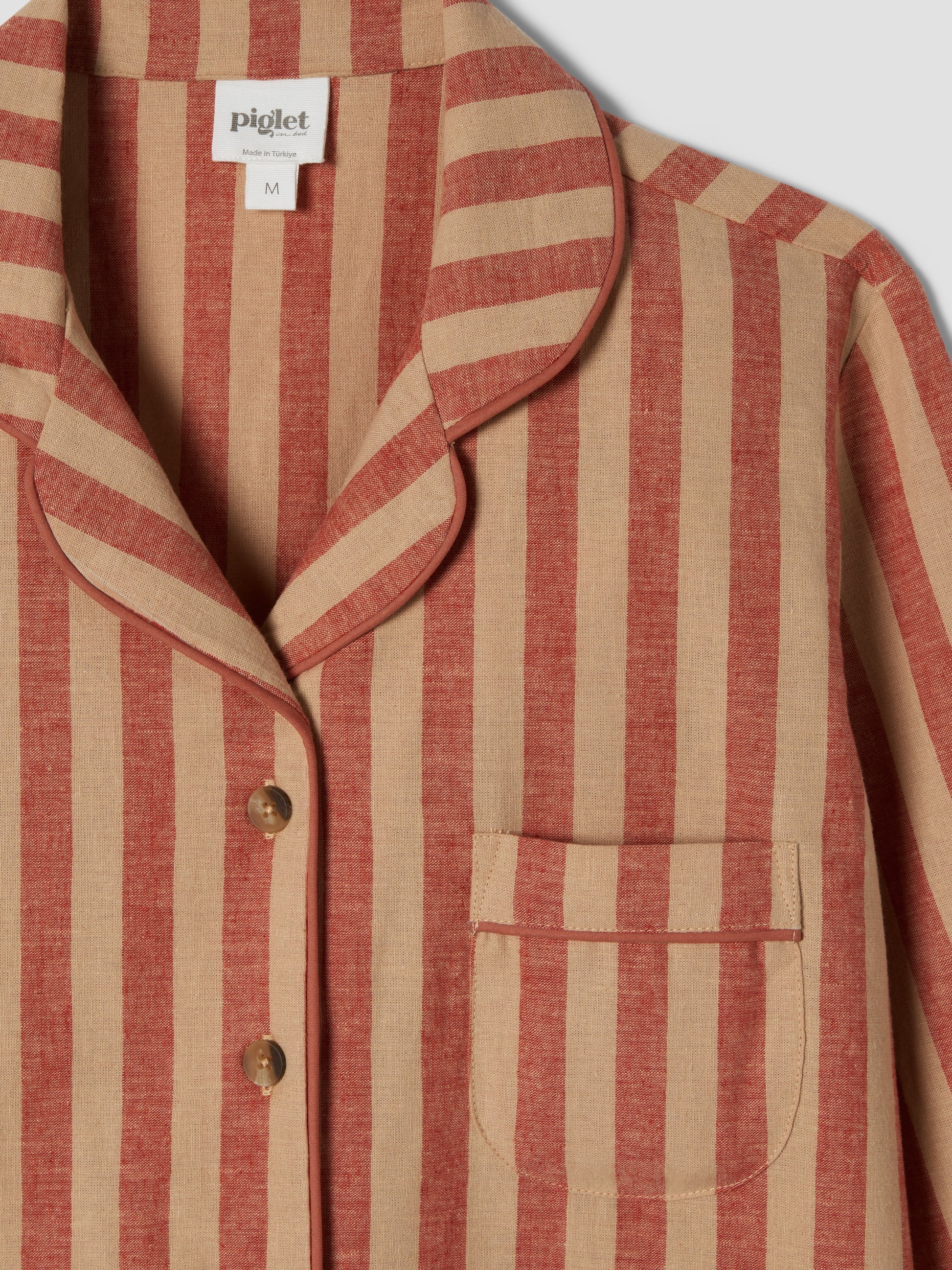 Slip into our Sandstone Red Pembroke Stripe trouser set for elevated evenings on the sofa and leisurely mornings in bed. Crafted from our signature blend, these breathable pyjamas combine the effortless look of linen with the gentle softness of cotton.