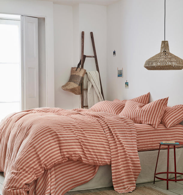 Keep your essentials neatly organised at home or on the go with our linen blend wash bag, thoughtfully crafted from offcuts of our Sandstone Red Pembroke Stripe fabric. Perfect for travel or tidying up your bathroom shelf, these wash bags have a quilted design, secure zipper closure and a coated cotton lining for easy cleaning.