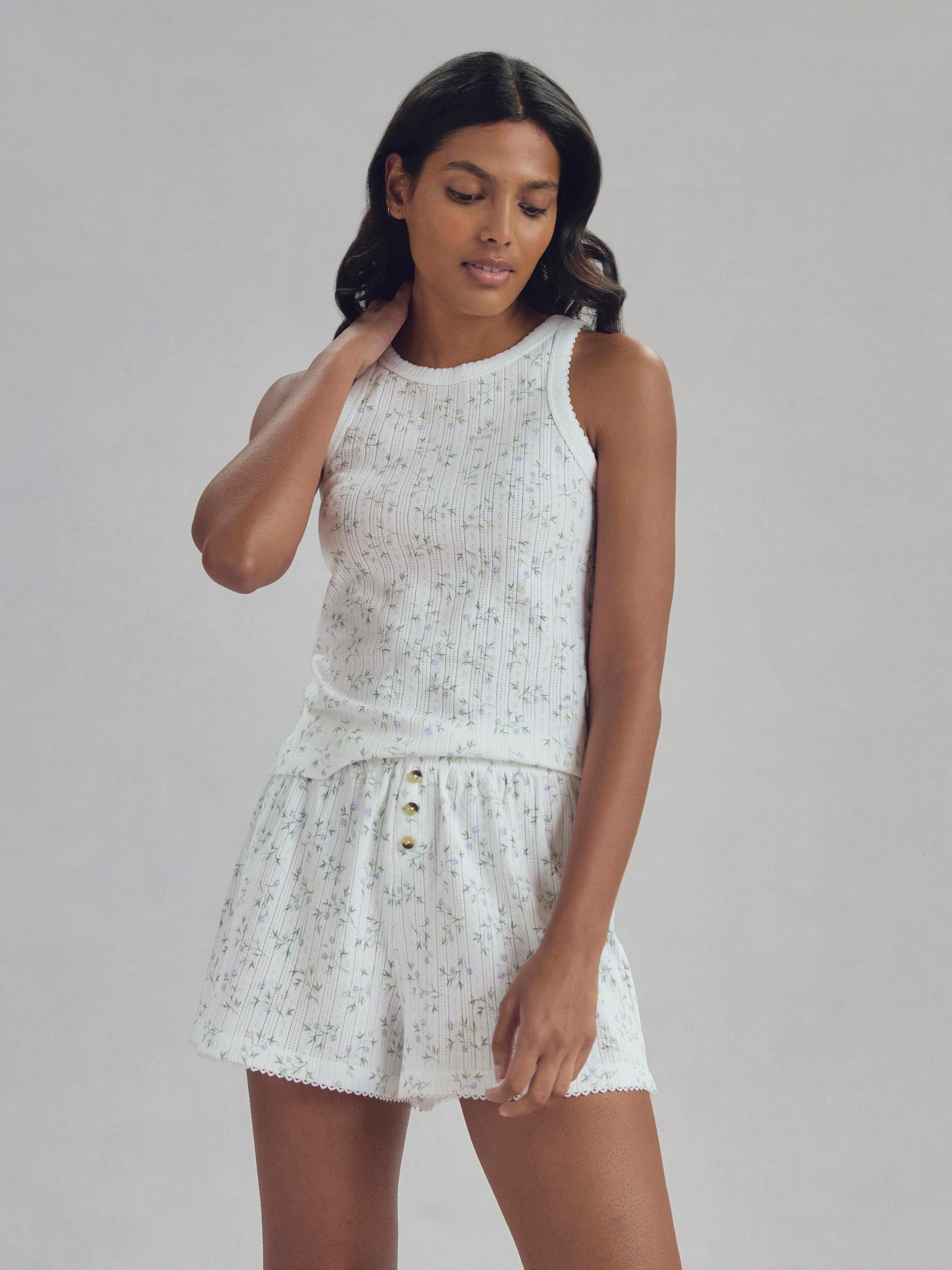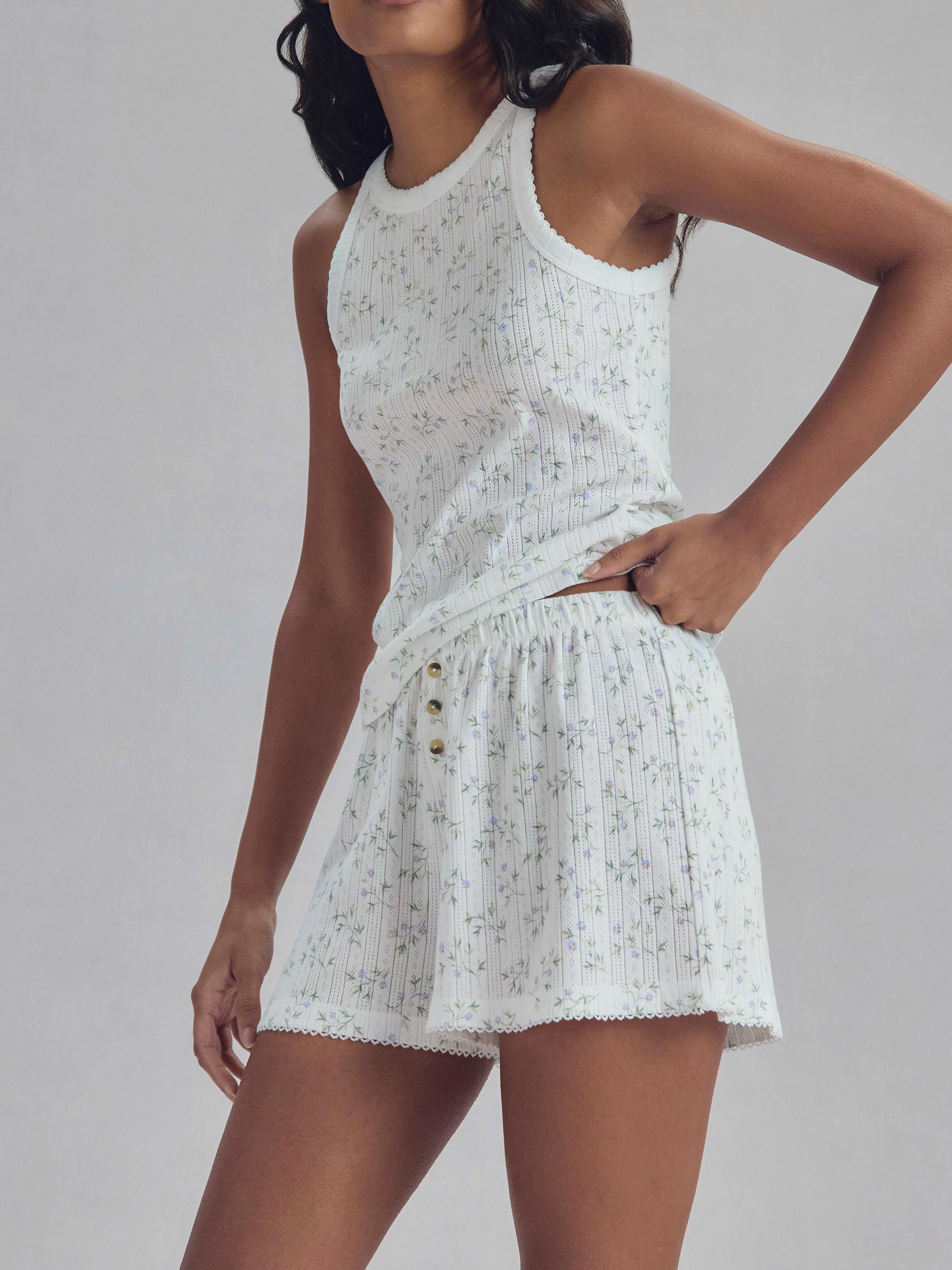 Our boxer-style pyjama shorts are made from 100% organic cotton with a breathable pointelle base and delicate floral Spring Sprig print. Comfortable and airy, they’re finished with fly detailing and a picot trim hem.