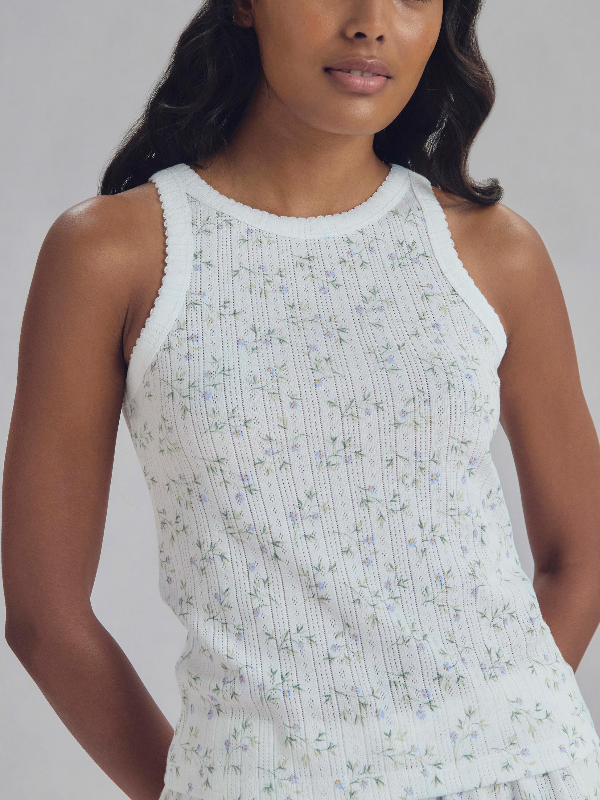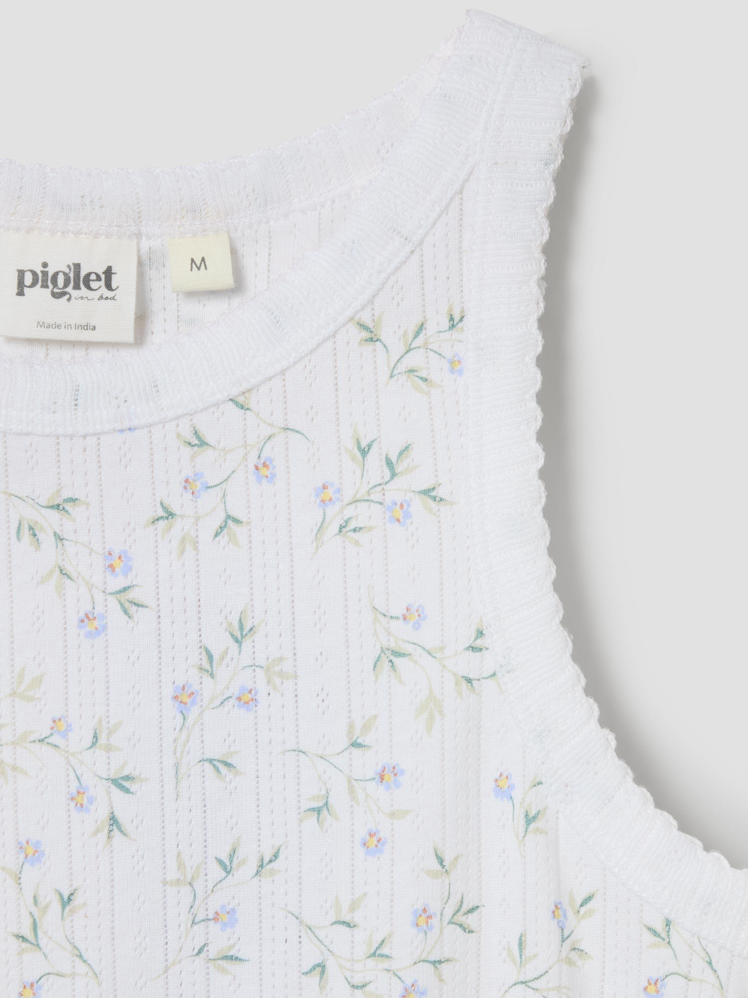 The Spring Sprig pyjama vest is a simple racerback style, made from lightweight organic cotton with a textured pointelle knit and soft floral Spring Sprig print. An easy mix-and-match piece, it’s perfect for layering or warm nights.