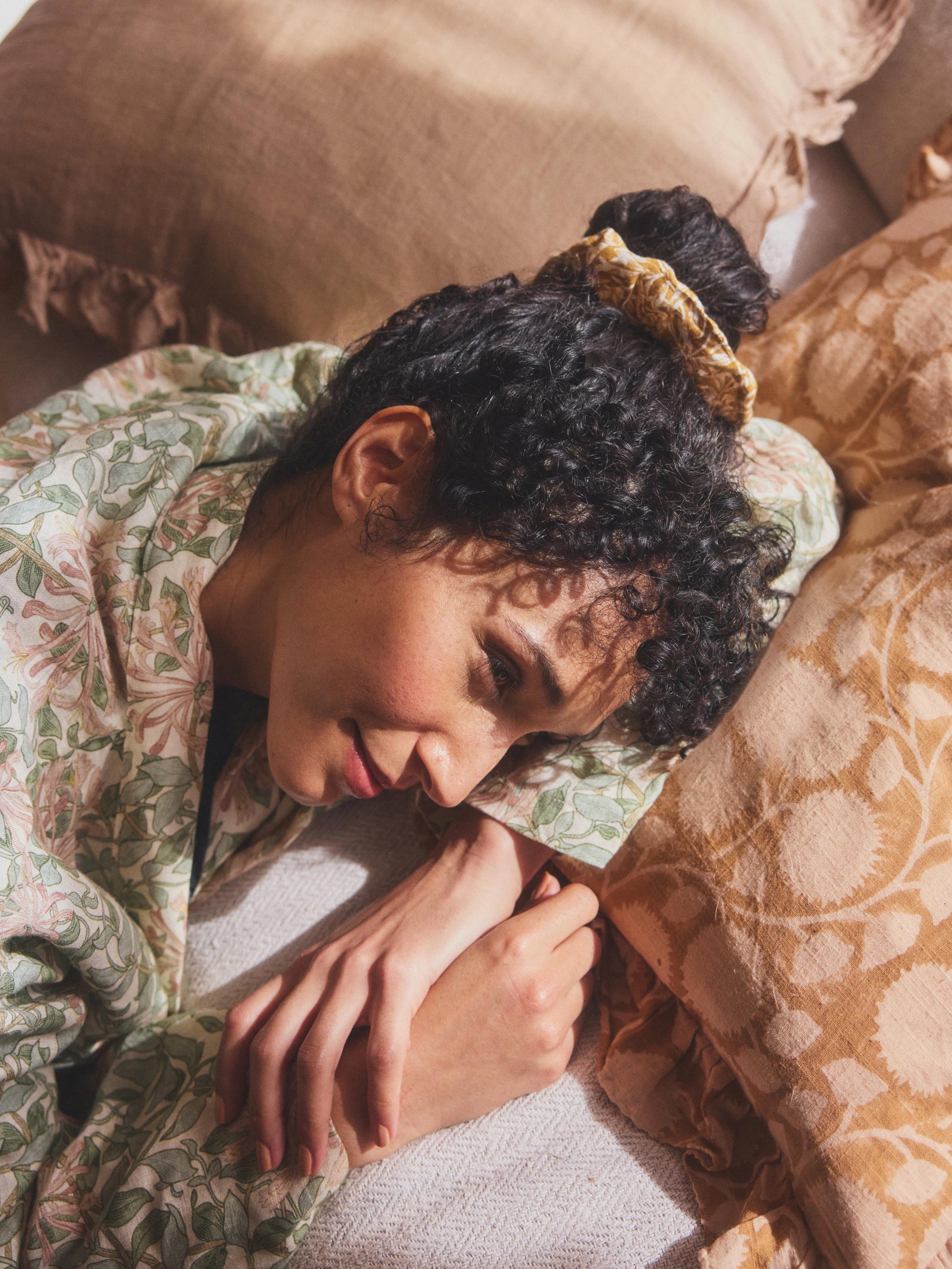 Beautiful fabrics are too good to waste, so this Sussex Rush linen scrunchie is made from offcuts from our Morris & Co. collection. Featuring entwining stems and delicate leaves in the much-loved Willow Boughs pattern, this scrunchie is the perfect accessory for nighttime or daytime. Coordinate with our matching robes, pyjama sets and eye masks for serious sleepwear style.