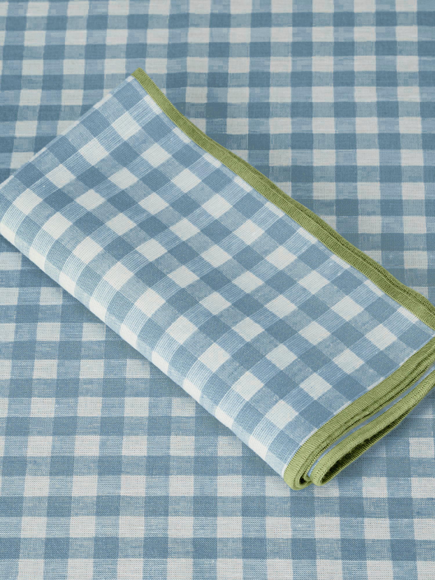 Made in Portugal, our Gingham Linen Napkin Set consists of a set of four napkins, made from 100% stonewashed European linen. Shown here in our calming shade of Warm Blue, embellished with a contrasting overlocked border in a light green. Complement your napkin set with the rest of our gingham linen tableware range, including placemats, runners and tablecloths.